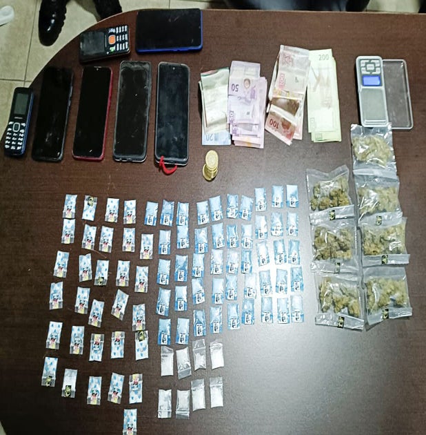 Durante su revisión fueron localizados 40 gramos de presunta marihuana, 65 gramos de droga sintética “cristal”, 12 gramos de probable cocaína, además de una báscula gramera, 5 mil 700 pesos y siete celulares, dos de ellos utilizados para colocar las dosis de narcóticos en el espacio de batería.